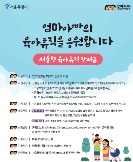 서울시에서는 "서울형 육아휴직 장려금"첫 도입 저출생 극복을 위한 엄마, 아빠 행복 프로젝트의 일환으로 2023년 9월 1일부터 신청을 받는다고 한다. 1인당 최대 120만 원 가구당 최대 240만 원으로 전국최초 엄마아빠 대상 지원사업이다.