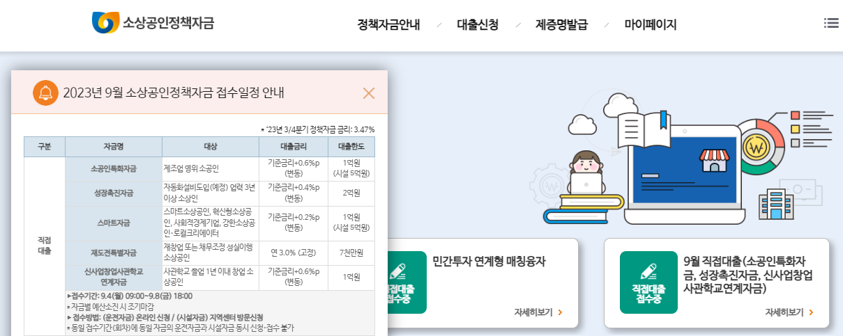 대출금리 : 기준금리 3.47% + 0.2% p (예산소진 시 자금별 조기마감 될 수 있습니다.)