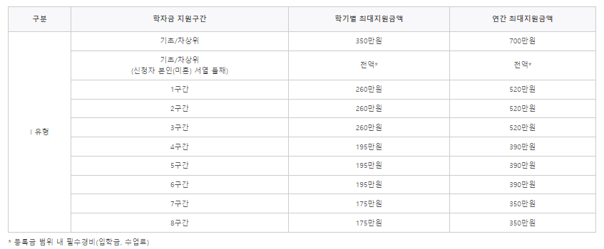 등록금 범위 내 지원구간별 차등지원 된다.(학자금 지원구간별 해당 학기 등록금 필수경비 :입학금 수업료)를 초과하지 않는 범위 내에서 차등지원