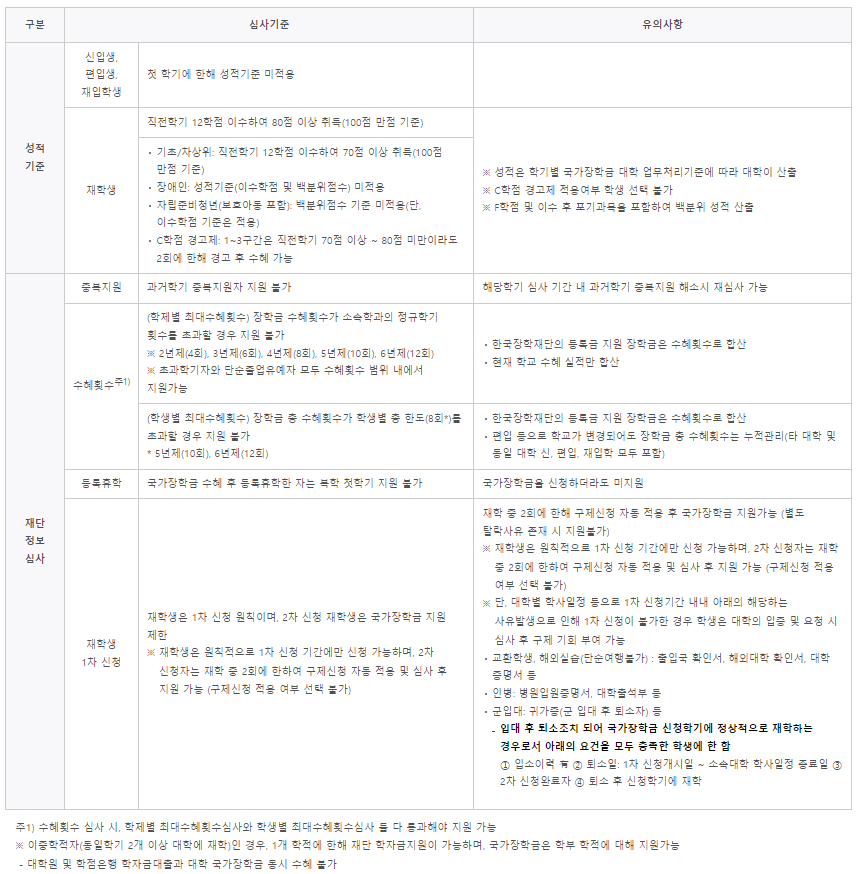 - 잘못된 학적으로 신청(신입생, 편입생, 재입학생, 재학생) 시 심사가 지연되거나 수혜 불가
