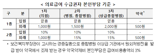 ●지원기준 : 의료급여는 기존과 동일하게 급여대상 항목에 대한 의료비 중 수급자 본인부담 금액을 제외한 전액을 지원한다. 본인부담 기준은 크게 1종, 2종(입원, 외래)으로 나뉘며, 1차(의원) 2차(병원, 종합병원) 3차(상급종합병원) 분리된다. 약국은 약국약제비 본인부담음 급여비용 총액의 3%이다.