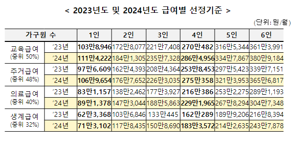 2024년도 생계급여 지원기준 역대 최대인 13.16% 인상(4인가구 기준)