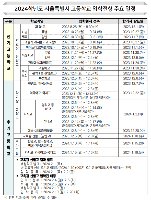 2024년 서울시 교육청은 학생의 적성에 맞는 학교를 선택할 수 있도록 다양한 학교 유형별 맞춤형 정보를 제공하여 학생들의 진학에 도움을 주기 위해 전형일정, 지원자격 등을 안내하고 있습니다.
