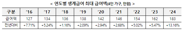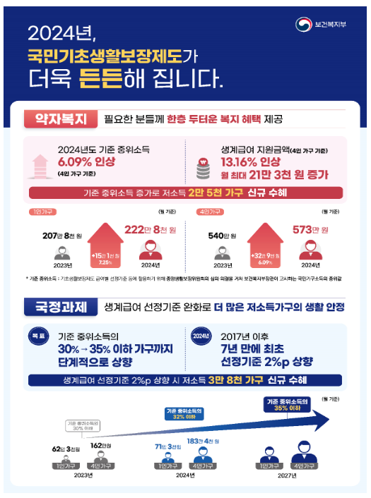 2024년도 생계급여 지원기준 역대 최대인 13.16% 인상(4인가구 기준)