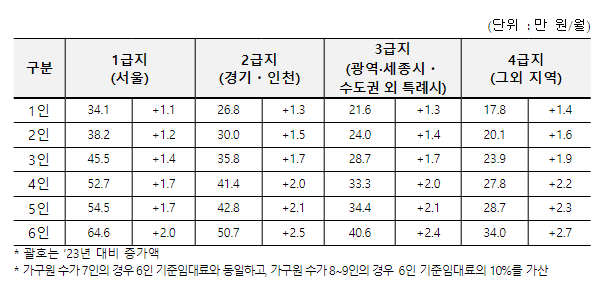 ●최저보장 수준 : 2023년 임차급여 지급 상한액 대비 2024년에는 월 최소 3.2% 에서 월 최대 8.7% 인상된다. 급지별·가구원수별 연간 최소 132,000원 에서 최대 324,000원이 증가된다.