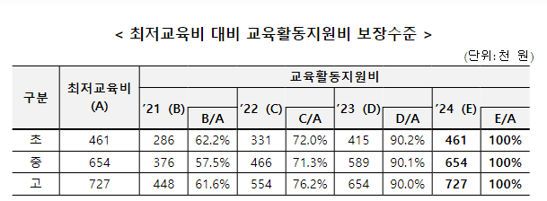●최저보장 수준 : 2023년 교육활동지원비 대비 46,000원 에서 73,000원으로 약 11% 증가되며, 2024년 교육활동지원비를 최저교육비의 100% 수준까지 인상된다.