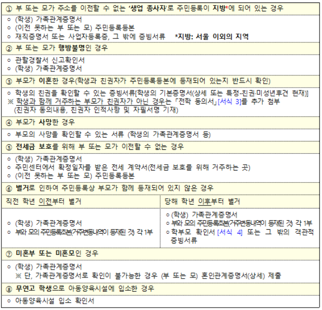 부 또는 모가 불가피하게 함께 이전할 수 없는 경우 추가 제출서류 필요 (아래의 표 참조)